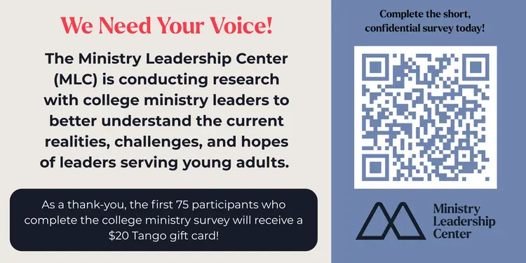 The Ministry Leadership Center (MLC) is conducting research with college ministry leaders to better understand the current realities, challenges, and hopes of leaders serving young adults—particularly in mainline contexts. The goal is to ensure that future programs and resources developed at MLC are